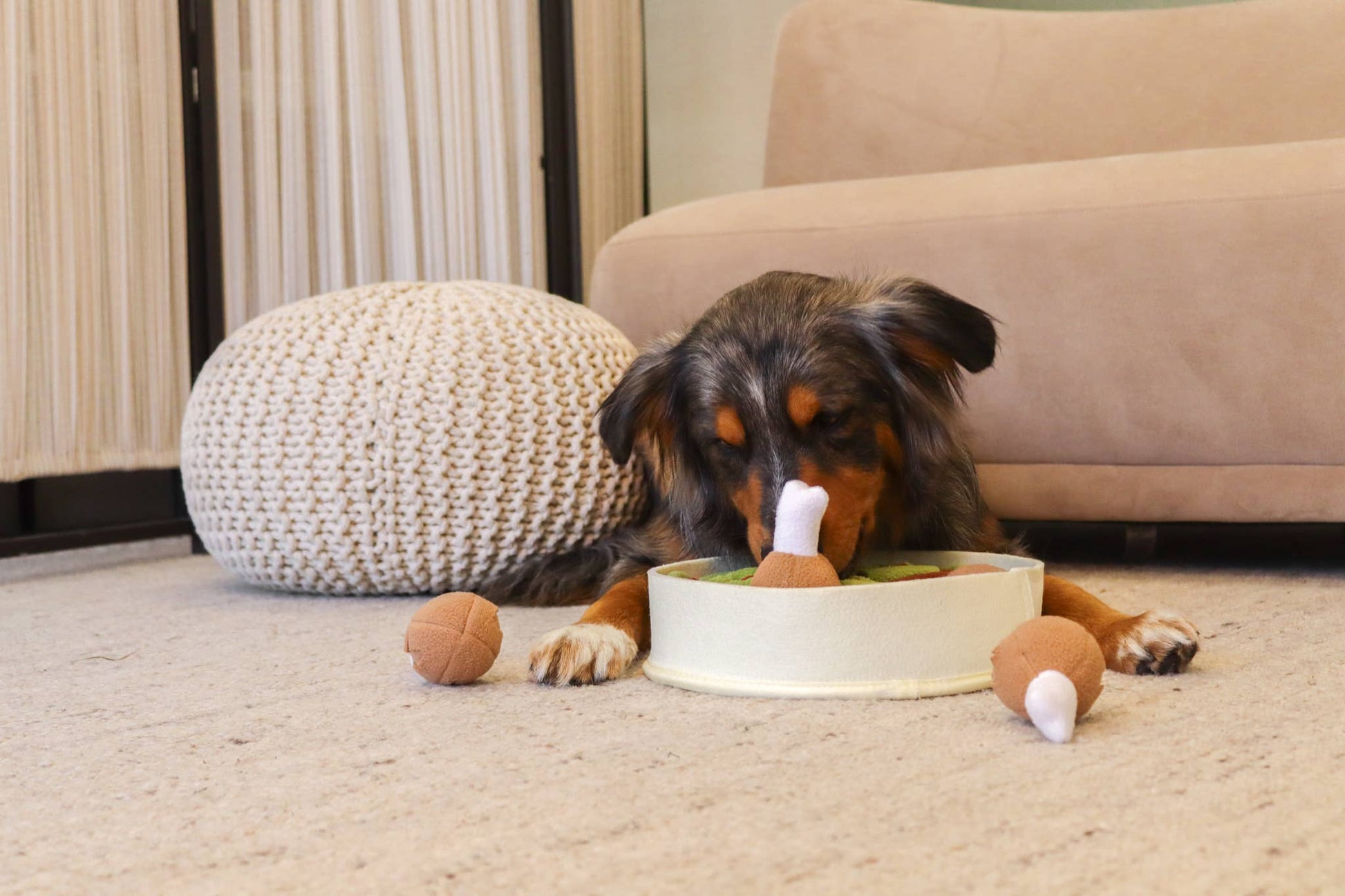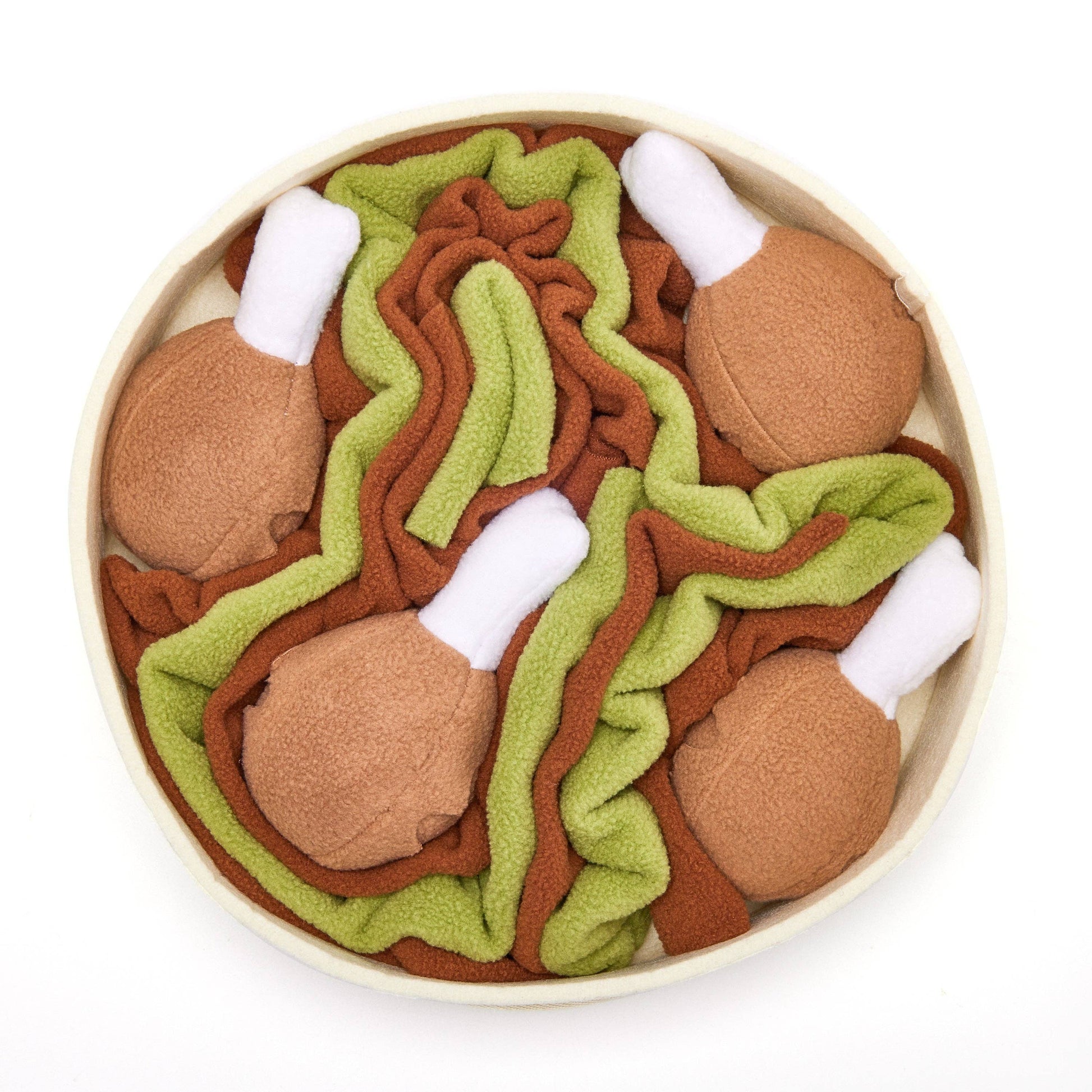 Introducing the Chicken n' Gravy Snuffle Bowl—an interactive toy designed to delight your pet! This innovative snuffle bowl features four detachable chicken legs, each equipped with squeakers and treat pockets for added fun. The bowl itself boasts a deep and tight snuffle area, perfect for hiding treats, kibble, or toys to stimulate your pet's senses.